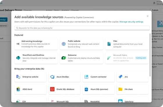 Select from more than 1,500 prebuilt data connectors across Microsoft and non-Microsoft data sources and connect to services that make your agent more efficient.